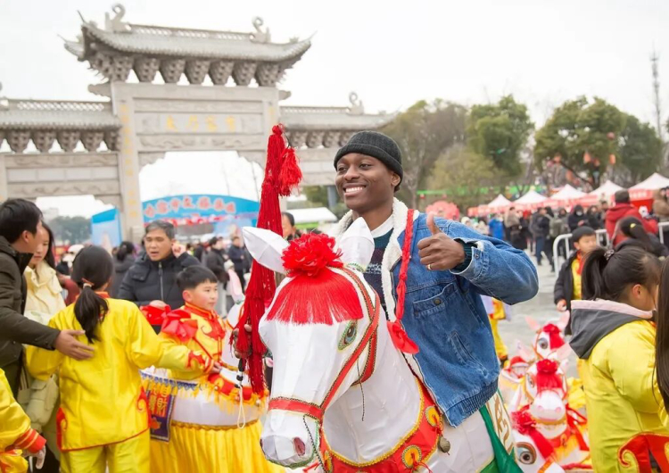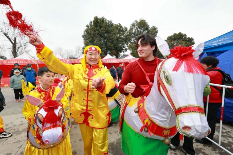 表演现场,非遗民俗表演马灯阵舞以其磅礴的气势尤为引人注目——16匹“大马”与16匹“小马”奔腾跳跃,展现了传统民俗的独特魅力与生生不息的传承力量。现场有一些来自江苏农林职业技术学院的外国留学生对句容的传统非遗艺术表现出了浓厚兴趣,他们不仅驻足观看、连连称赞,更亲自上阵体验、参与表演,在互动中感受中国春节文化的独特韵味。一位参与马灯舞体验的外国游客用流利的普通话笑着说:“非遗表演很精彩,很有趣!句容‘雷堆’好!”